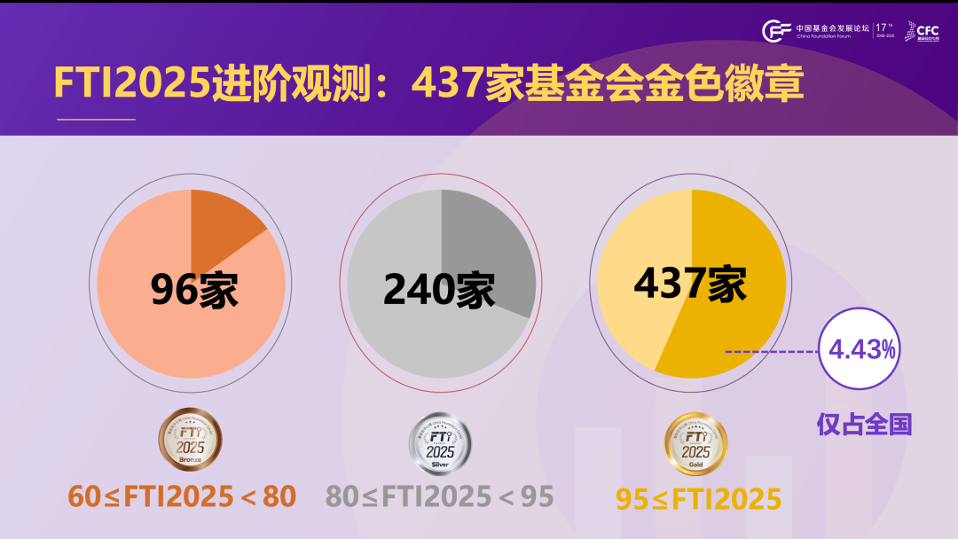 2025年度,共有774家基金会(含142家主动报名)进入透明指数进阶观测。最终全国有437家基金会分数大于等于95分,获得了“FTI2025金色徽章”,仅占全国基金会总数的4.43%。