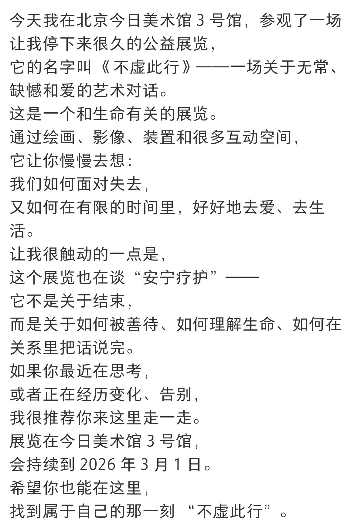 正在今日美术馆3号馆呈现的年度生命艺术展「不虚此行」,将视角聚焦安宁疗护与生命教育,以"无常、缺憾和爱"为核心命题,回应中国社会老龄化背景下公众对生死议题的真实需求,引导观众正视死亡、珍惜当下。