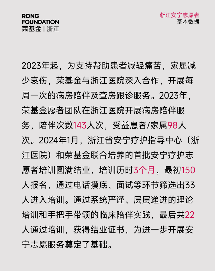 在浙江最近举办的老年高质量发展大会安宁缓和医疗论坛上,荣基金浙江志愿者负责人宋秀娟介绍说:“安宁志愿者带给我很多感动,志愿者面试的时候,有一位大学老师,她面试结束后在楼道里等了将近2个小时,等到所有人的面试都结束后,她又敲门进来,说希望我们一定要给她这个机会,让她来做安宁志愿者。这让我们非常感动,当我们答应她后,她特别开心地跳了起来。现在,人们衡量一个人的价值往往是以创造财富的能力来衡量,在这样一种价值观盛行的环境中,这些可爱的人,他们是为了什么呢?‘人之初,性本善’。每个人内心深处都有向善的一面,因为善代表了光明。”