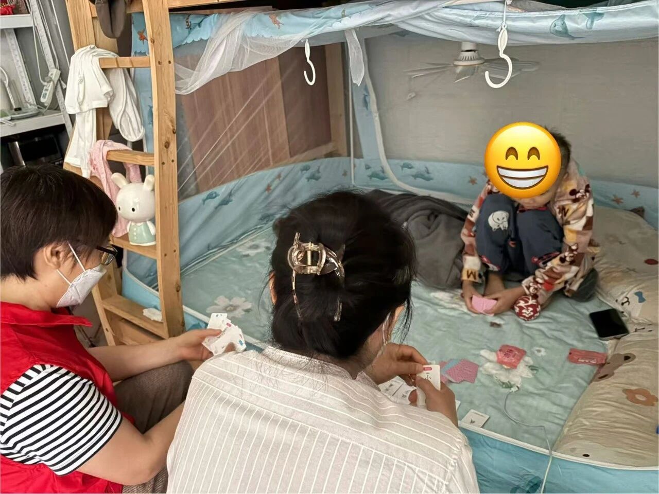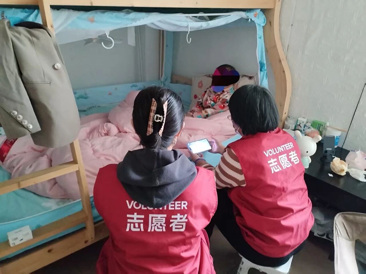 我和洁莹带着有点忐忑的心情来到可可(化名)就所住的小区,开门后,一个瘦小的身影闪现在我的视线中,但很快可可(化名)就爬上床躲进了被窝中。为了打开这个局面,姜老师就带头向他轻声细语的解释了我们的情况……看着孩子卷缩在被窝里小小的身子,我的内心充满了怜爱,多么希望他的病情能慢慢得以缓和,至少不要让他受太多的病痛折磨。时间过得很快,陪伴的形式也是各式各样,原来今天的少言少语,也是一种默契的相守,离开时可可(化名)跟我们一一挥手告别。——李建红、陈洁莹