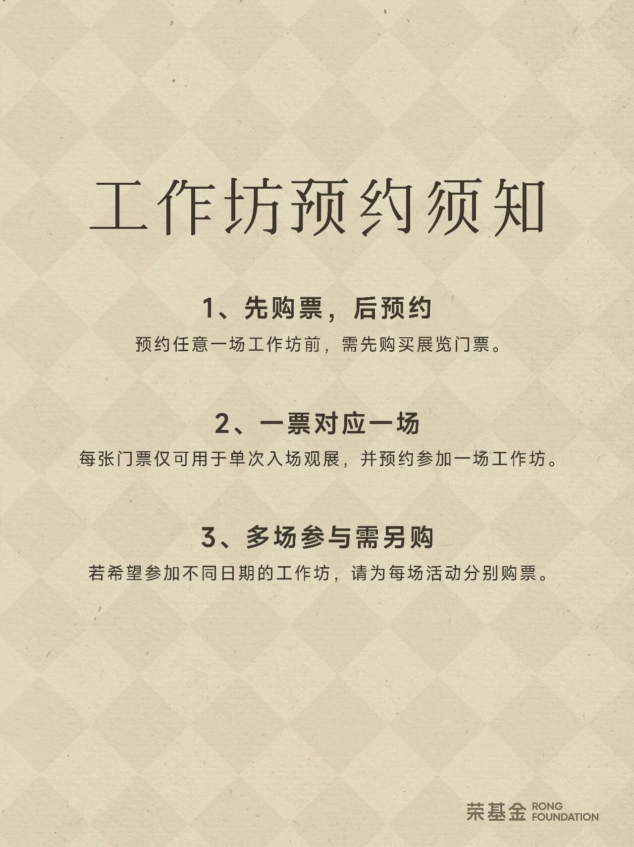 各位伙伴,本次展览期间,我们将推出多场不同主题的艺术工作坊。为了保障您的参与体验,现将预约及购票规则说明如下:
