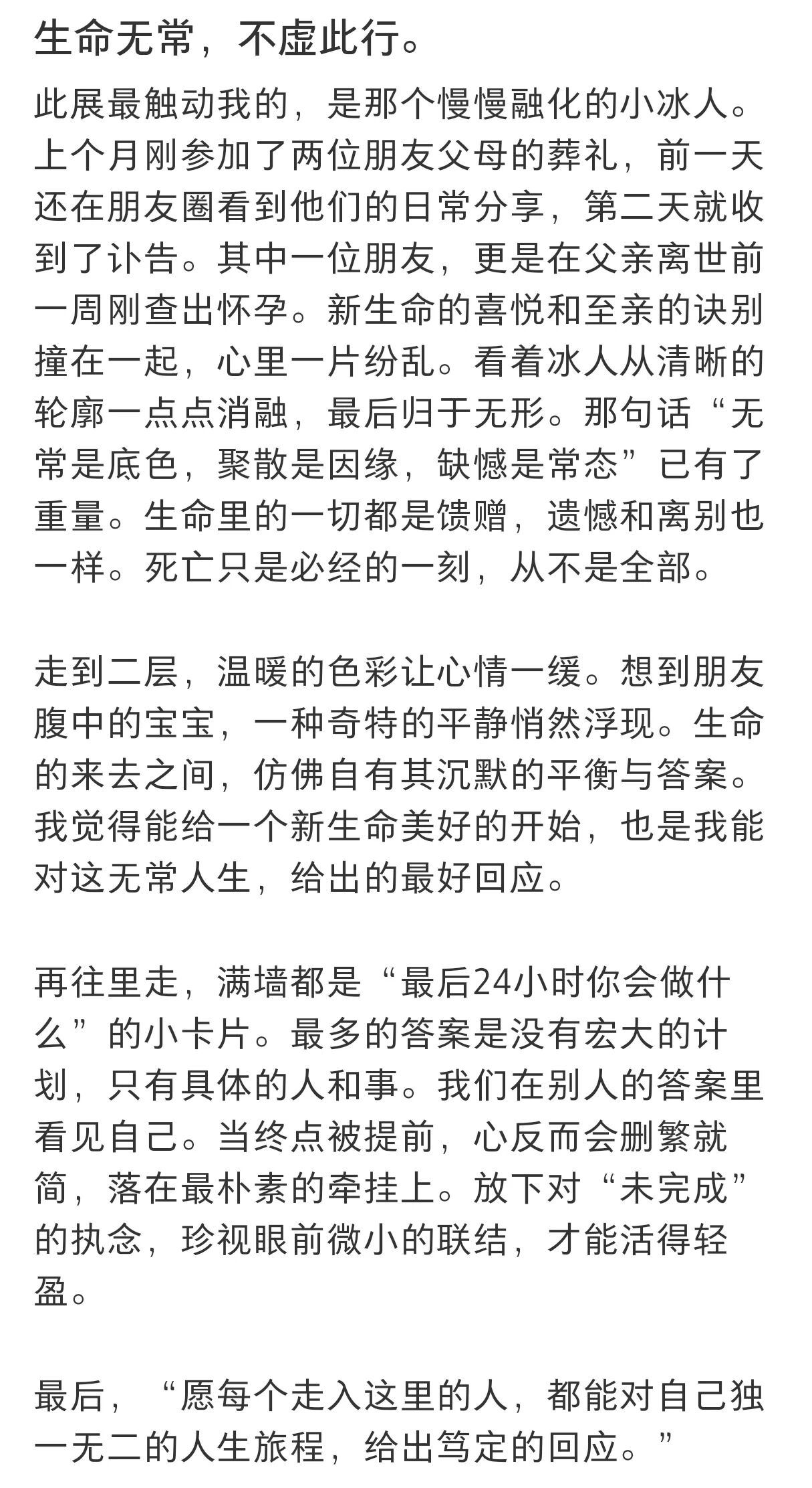 这不仅是一场关于生命的对话,更是一次关于如何活着的提醒。当我们学会正视无常、接纳缺憾,反而能更完整地感受当下的丰盛;当我们提前思考告别,反而能更有意识地珍惜相聚。走出展厅的那一刻,生命或许还是那趟没有彩排的旅程,但心中多了一份笃定,值得全力以赴,不虚此行。