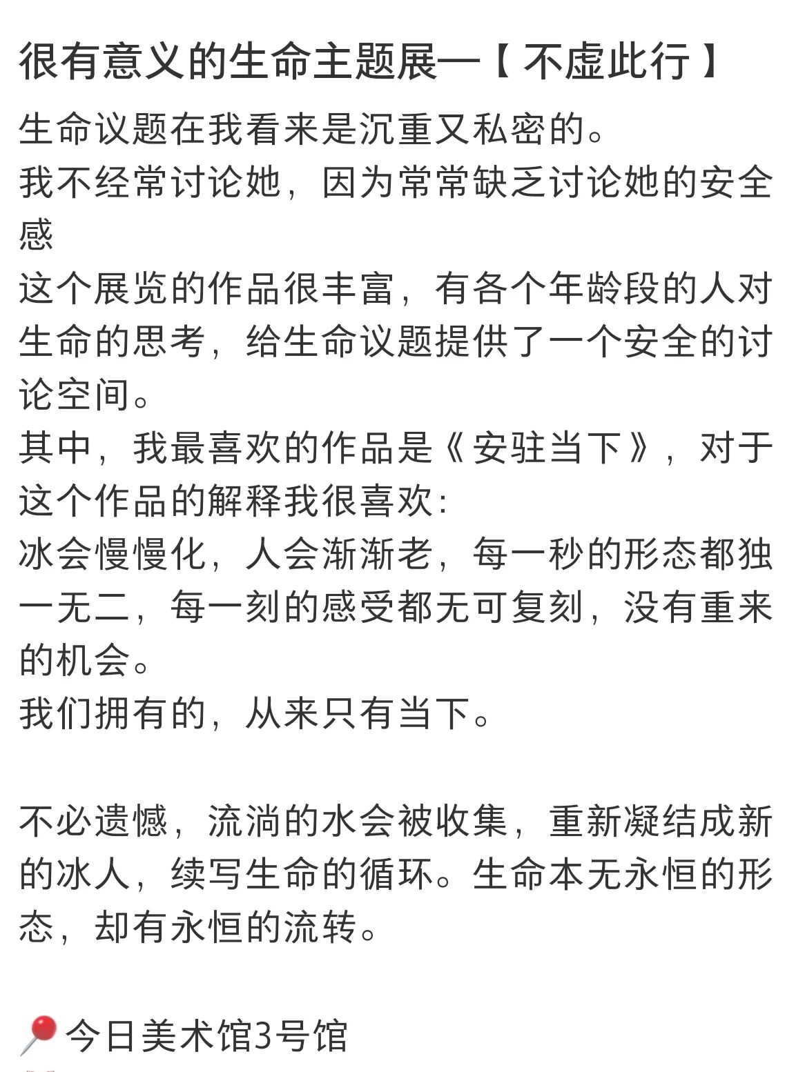 正在今日美术馆3号馆呈现的年度生命艺术展「不虚此行」,将视角聚焦安宁疗护与生命教育,以"无常、缺憾和爱"为核心命题,回应中国社会老龄化背景下公众对生死议题的真实需求,引导观众正视死亡、珍惜当下。